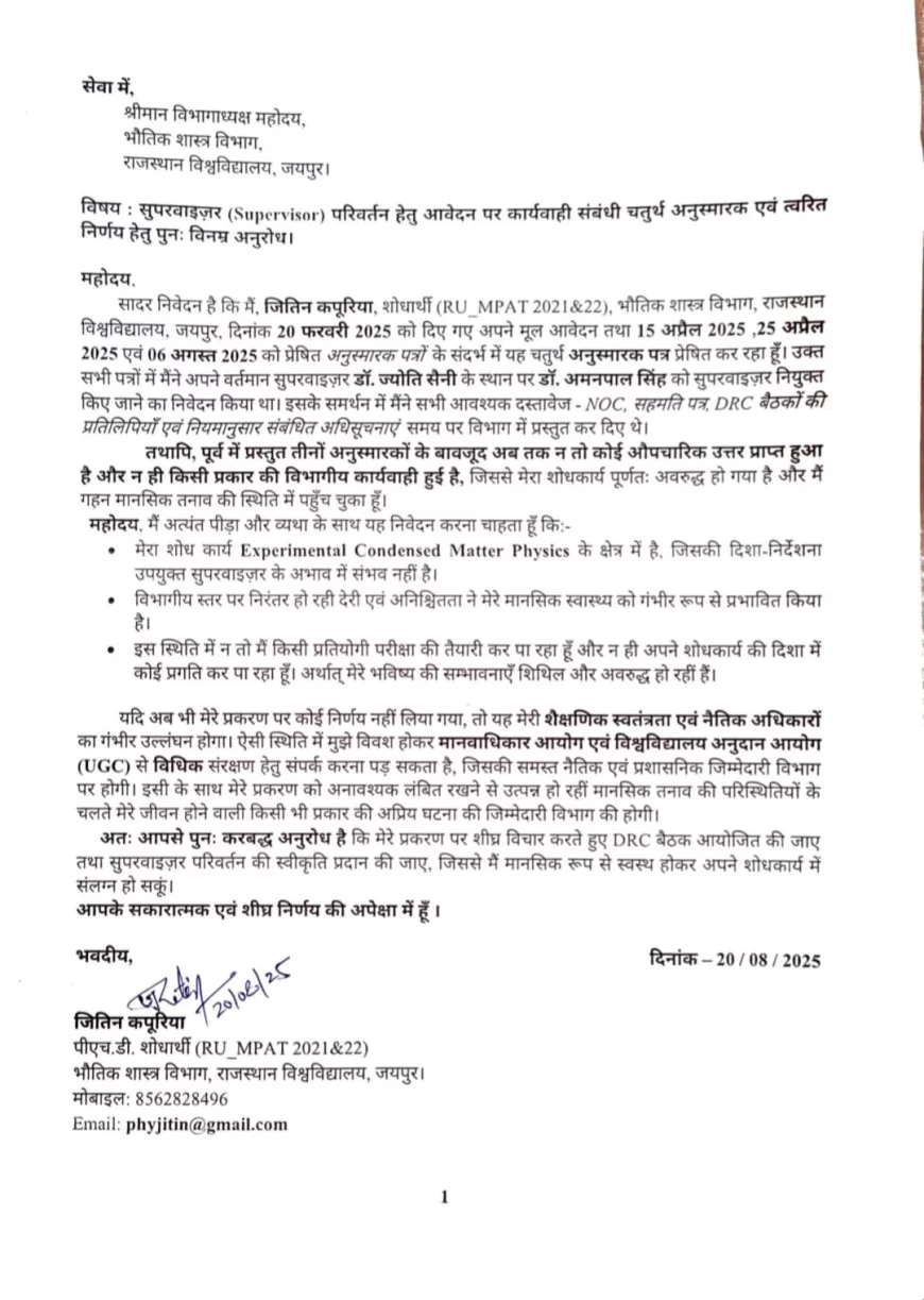 जयपुर, 13 सितम्बर — राजस्थान विश्वविद्यालय के भौतिकी विभाग में शुक्रवार को शोधार्थियों ने विभागाध्यक्ष (HOD) दफ़्तर के बाहर धरना देकर जोरदार नारेबाज़ी की। उनका आरोप है कि गाइड परिवर्तन और NOC (नो ऑब्जेक्शन सर्टिफिकेट) जैसी बुनियादी अकादमिक प्रक्रियाएँ महीनों से अटकी हुई हैं, जिससे छात्रों पर मानसिक दबाव बढ़ रहा है और अकादमिक व करियर अवसरों पर सीधा असर पड़ रहा है। प्रदर्शन का नेतृत्व छात्र नेताओं अरविंद नांगल, प्रदीप मांडोता, मनोज और राजकुमार ने किया, जिसमें दर्जनों शोधार्थी शामिल हुए।