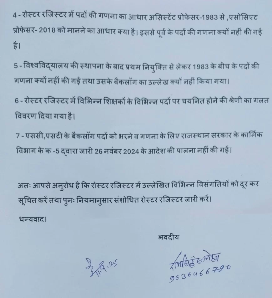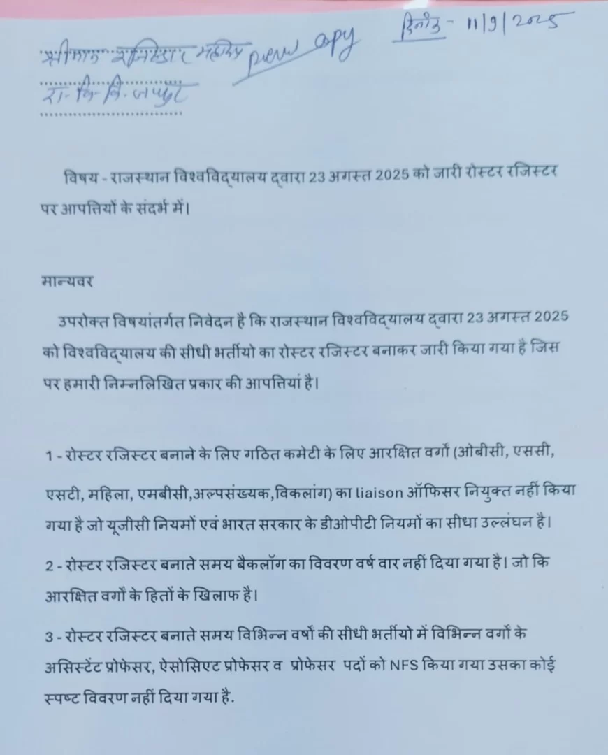 राजस्थान विश्वविद्यालय द्वारा शिक्षक पदों की सीधी भर्ती के लिए जारी नए रोस्टर रजिस्टर में ओबीसी, एससी, एसटी, एमबीसी व अन्य आरक्षित वर्गों के आरक्षण अनुपात और पदों की गणना में भारी विसंगतियां पाई गईं। पूर्व छात्रसंघ अध्यक्ष डॉ. रामसिंह सामोता सहित कई छात्रों ने रजिस्ट्रार को ज्ञापन सौंपकर इन विसंगतियों पर आपत्ति दर्ज कराई और जल्द सुधार की मांग की।